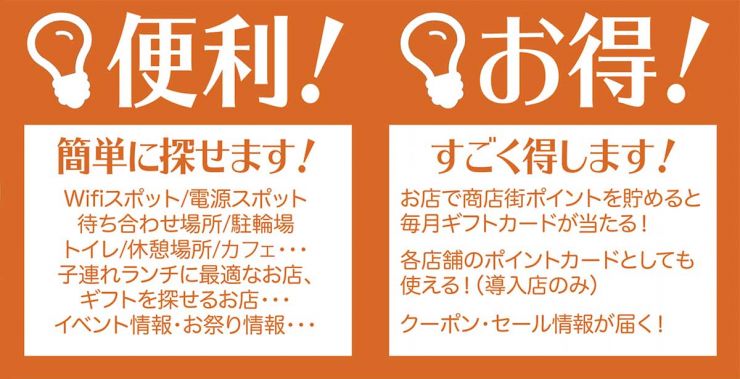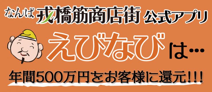 戎橋筋商店街では定期的に様々なイベントやセールを行っています。えびなびがあれば、商店街を存分に楽しむことができ、お得にお買いものができます。また、地域情報や公共的な情報も配信します。